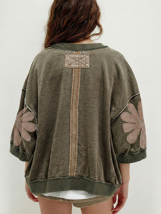 Mineral Wash Raw Seam Patchwork Flower Patched 3/4 Sleeve Loose Top